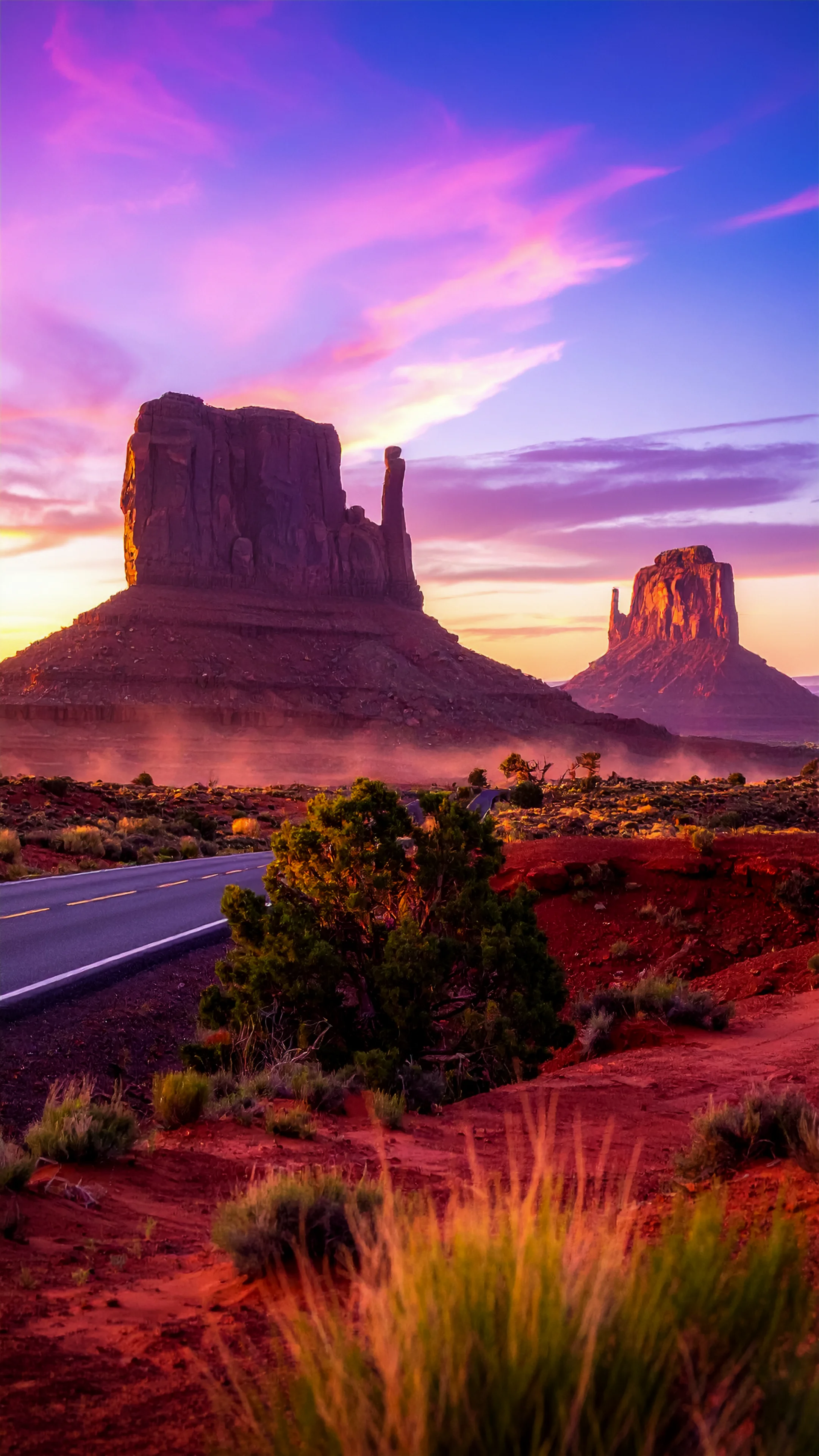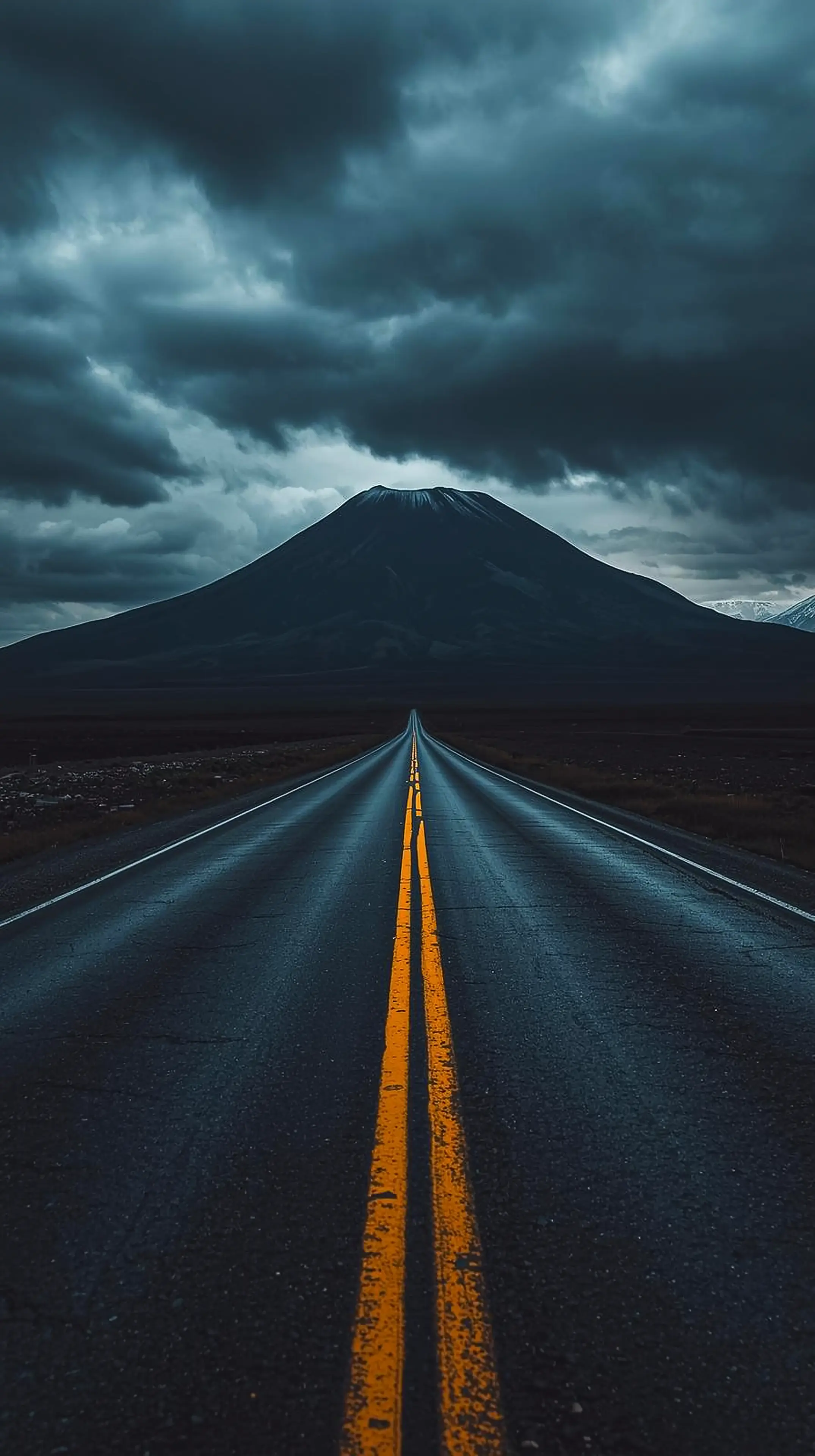 4k wallpaper for mobile Moody Dark Road to Majestic Volcano Mountain, Epic Stormy Sky Over Empty Highway with Glowing Yellow Lines Aesthetic