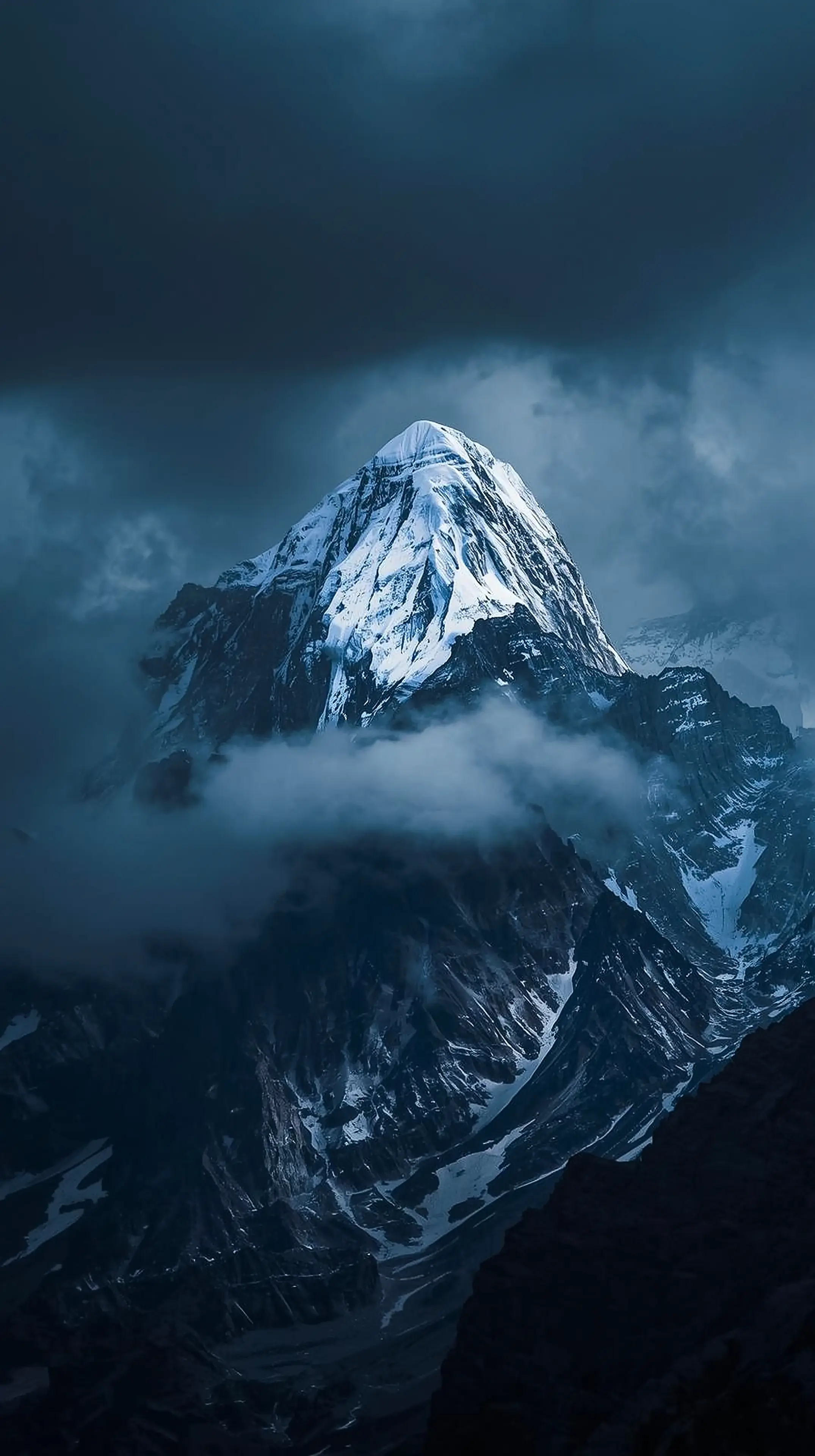 iphone wallpaper 4k Majestic Snow-Capped Himalayan Peak at Twilight Golden Sunlit Summit Dark Blue Night Sky Dramatic Mountain Landscape
