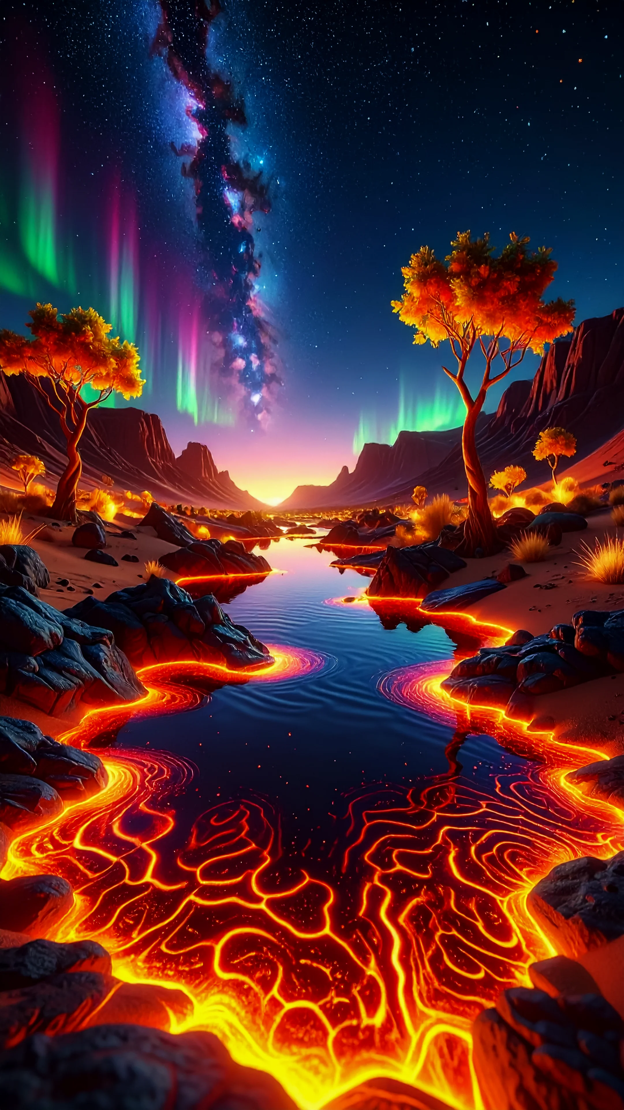 Dramatic sunset over Namib desert dunes, rich orange-red sand waves, lone camel thorn tree silhouette, deep blue sky, epic minimalist composition_ cinematic depth of field, ultra-detailed petals