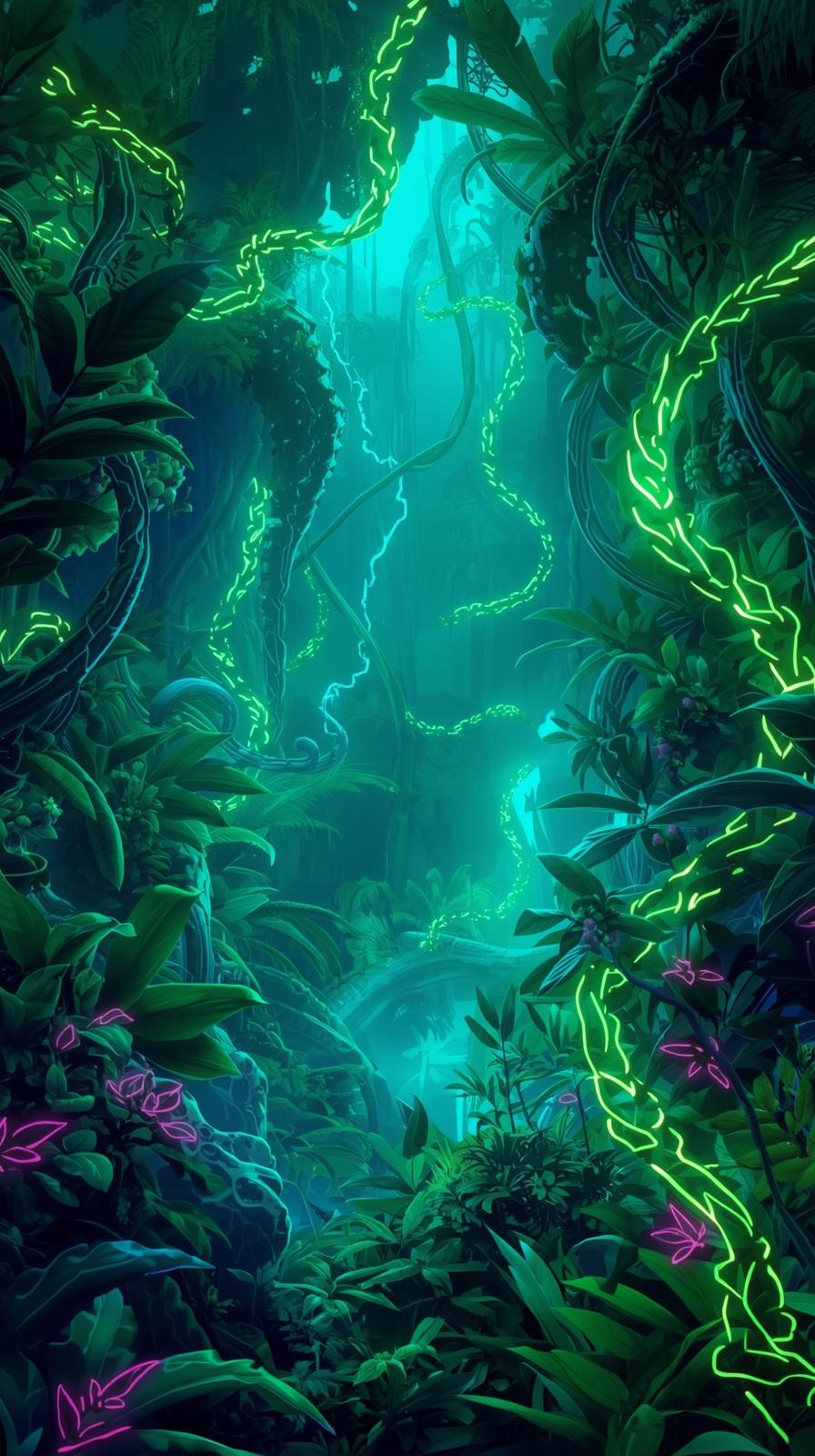 iphone wallpaper 4k Surreal Neon Jungle Forest Glowing Green Cyan Vines Twisting Through Lush Foliage Pink Butterflies Magical Glow