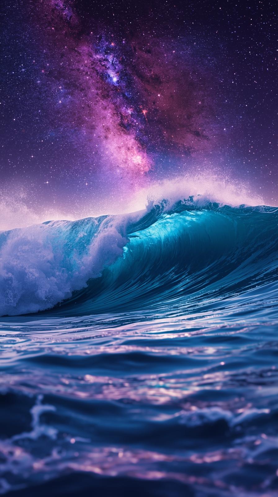 4k wallpaper for mobile Epic Milky Way Wave Curling in Deep Blue Ocean with Purple Galaxy Sky Sparkling Stars and Neon Glow