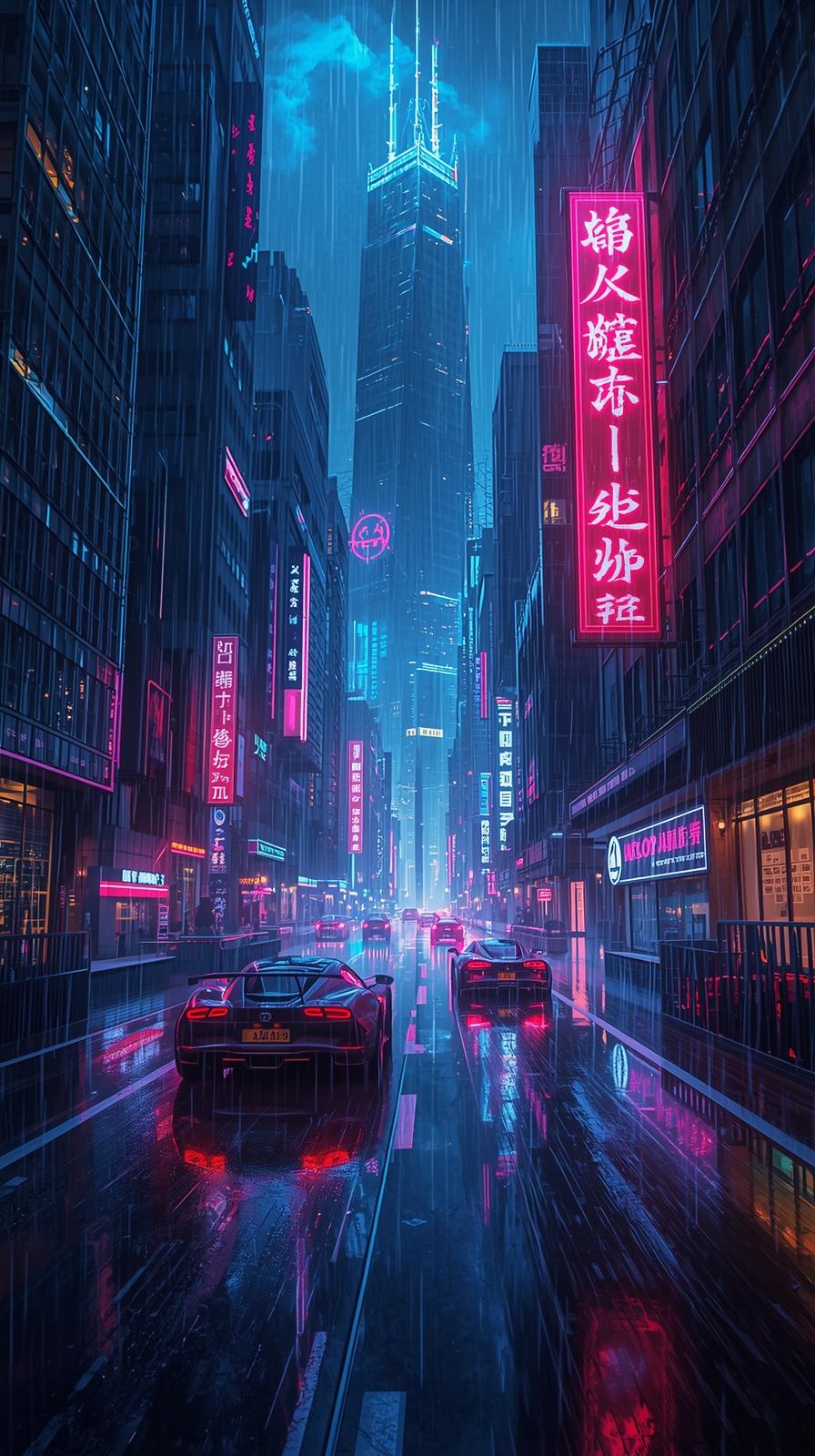 4k wallpaper for mobile Futuristic Cyberpunk City Street in Heavy Rain with Vibrant Neon Signs Glowing Reflections