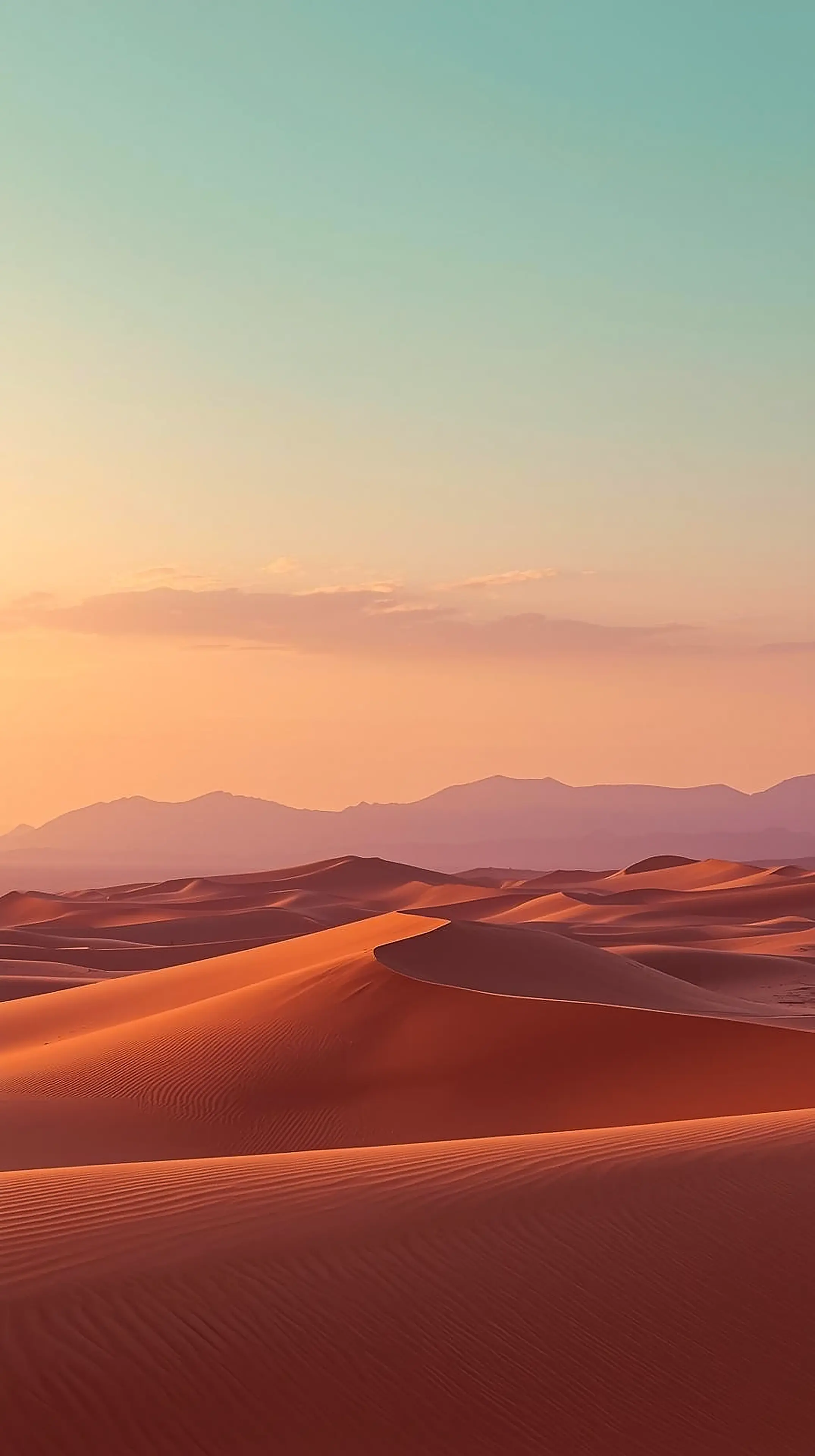 4k wallpaper for mobile Serene Desert Dunes at Sunset, Golden Sand Ripples with Turquoise Sky and Distant Mountains Peaceful Landscape