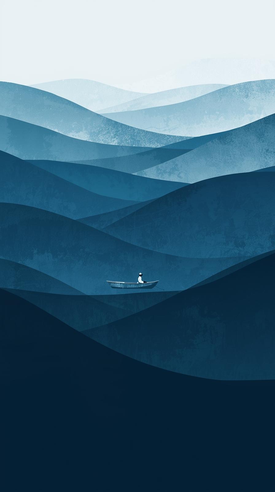 iphone wallpaper 4k Serene Minimalist Fisherman in Small Boat on Endless Blue Mountain Waves Dreamy Monochrome Landscape Peaceful Zen Aesthetic