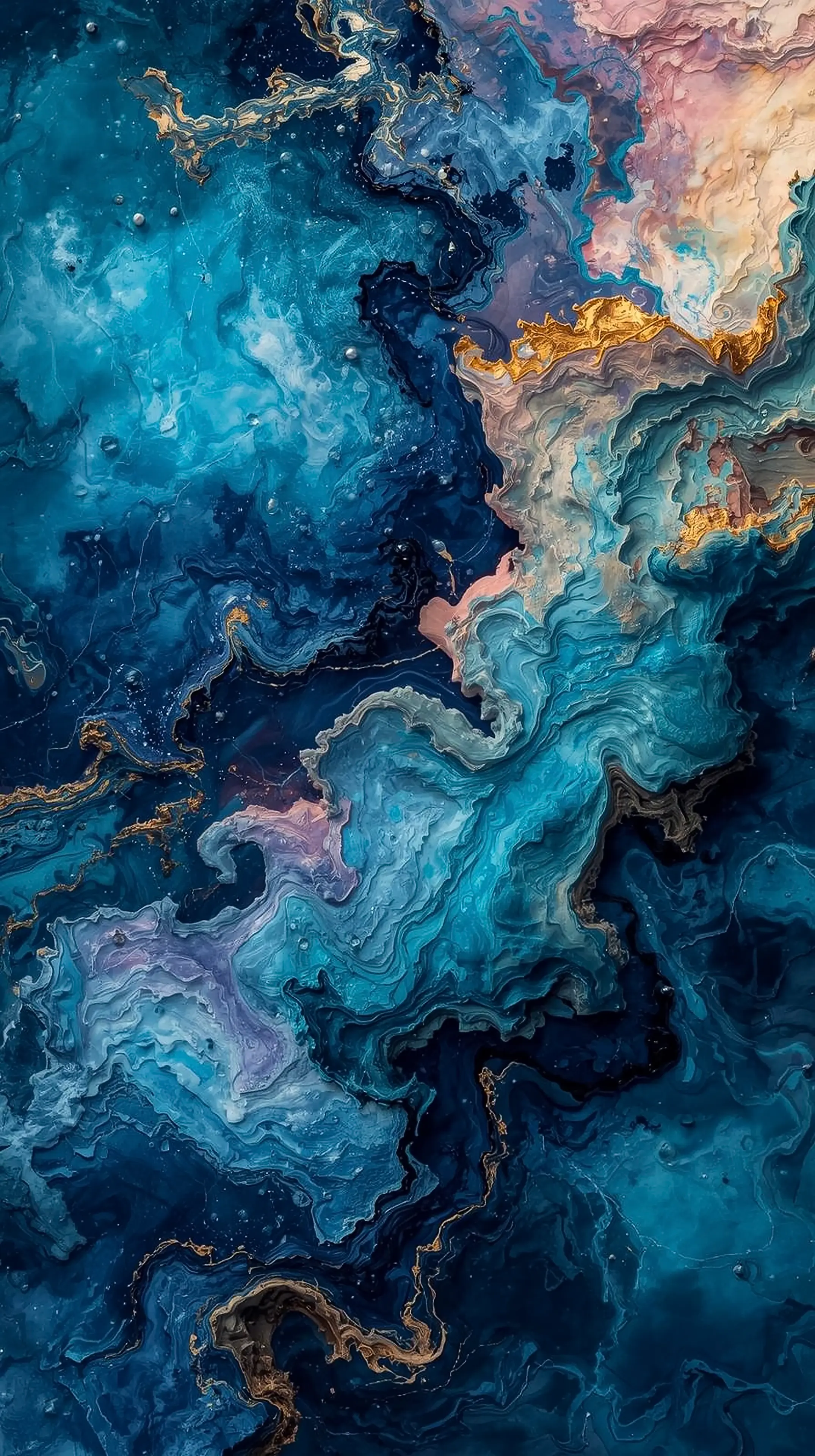 4k wallpaper for mobile Luxurious Teal Blue Gold Marble Fluid, Iridescent Abstract Resin Art with Rose Pink Accents and Metallic Veins