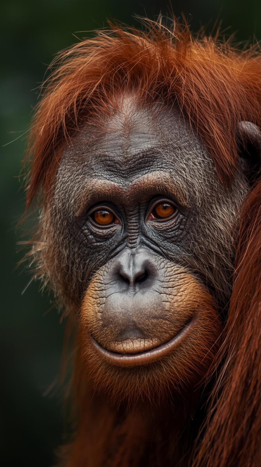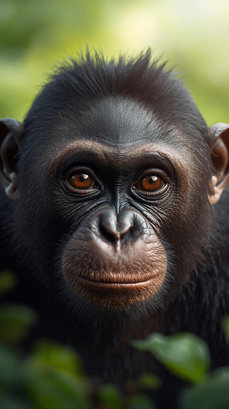 This high-definition wallpaper features a close-up portrait of a young chimpanzee with soulful brown eyes and a gentle smile. The detailed black fur and wrinkled skin texture create a realistic mood.