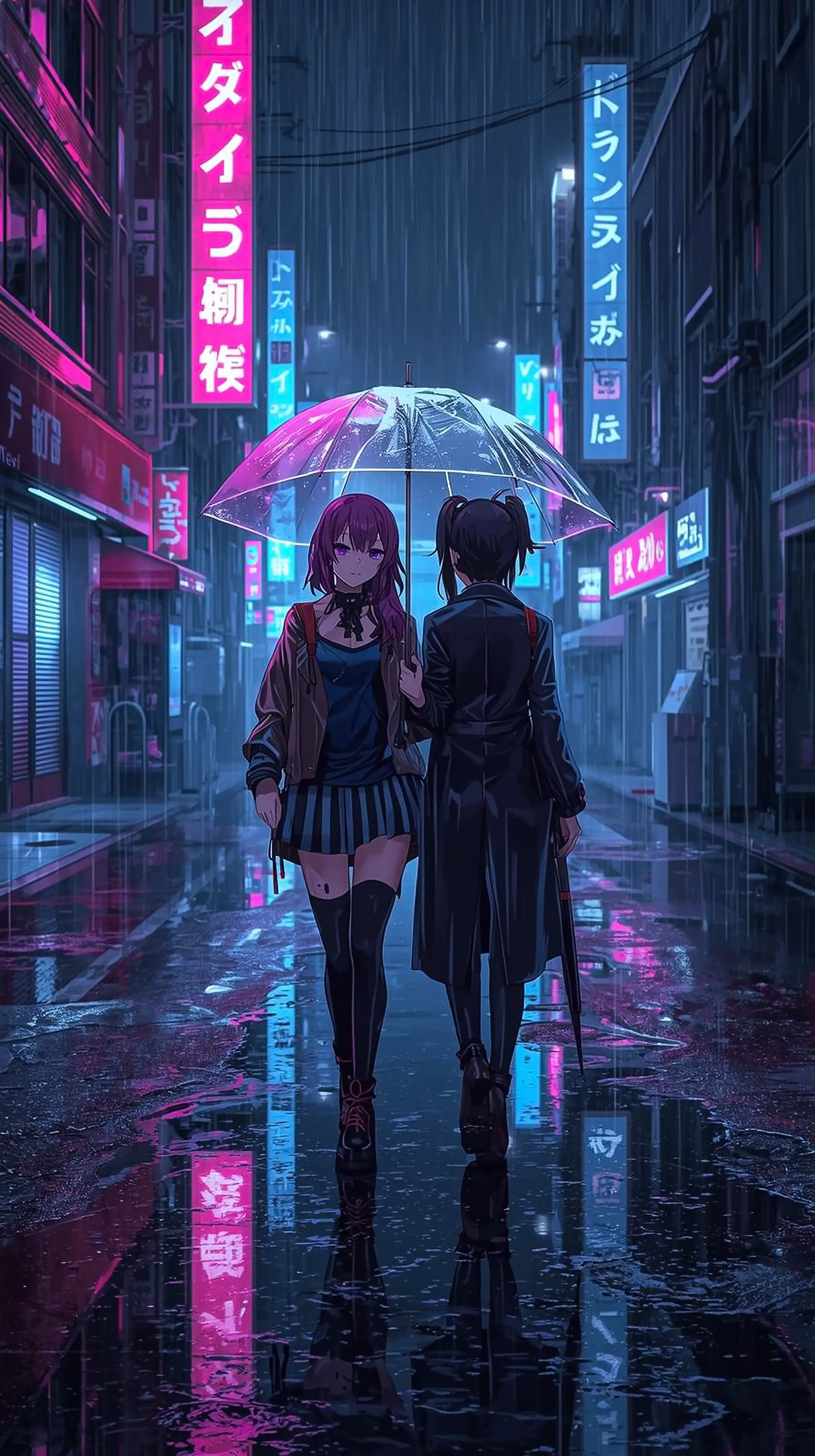 iphone wallpaper 4k Cyberpunk Anime Duo with Umbrella in Rainy Neon Street Purple Hair Twin Tails Glowing Japanese Signs Futuristic Vibe