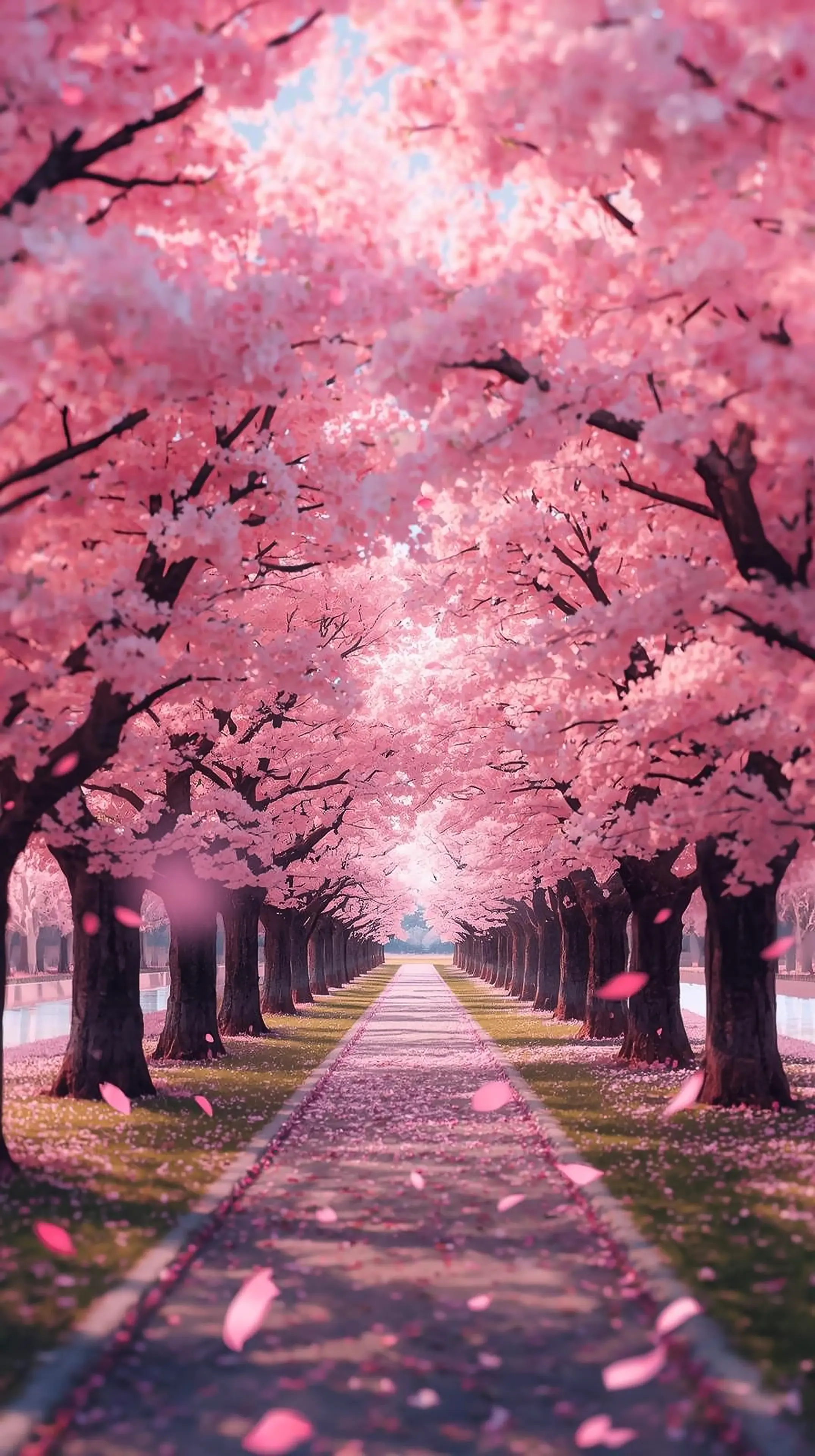 iphone wallpaper 4k Endless Sakura Blossom Tunnel Pink Cherry Trees in Full Bloom Falling Petals Serene Spring Pathway Under Blue Sky Dreamy Aesthetic