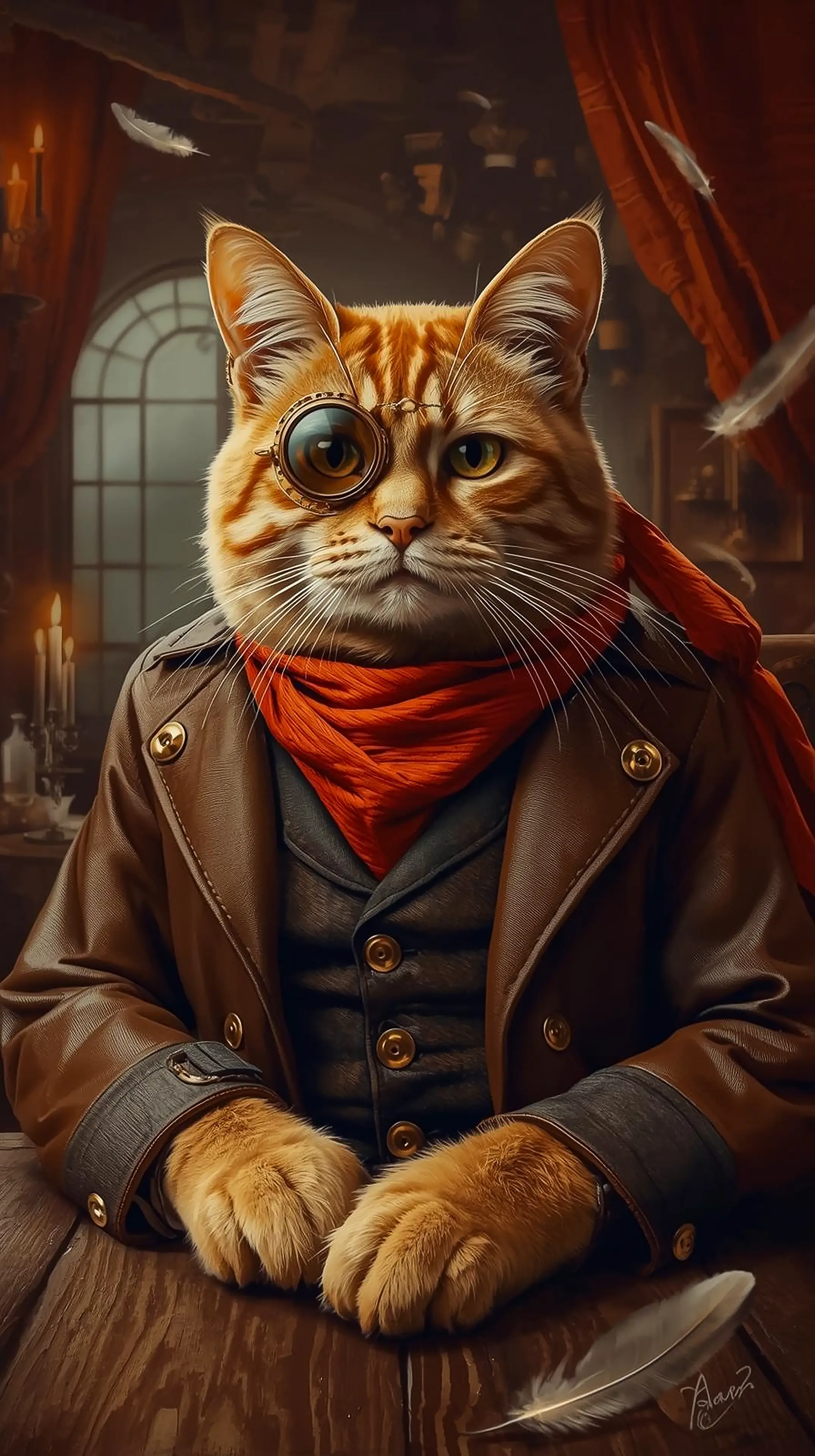 phone wallpaper 4k Cute Steampunk Ginger Cat Wearing Monocle Goggles Brown Leather Coat Red Scarf Feathers Cozy Vintage Room Aesthetic)