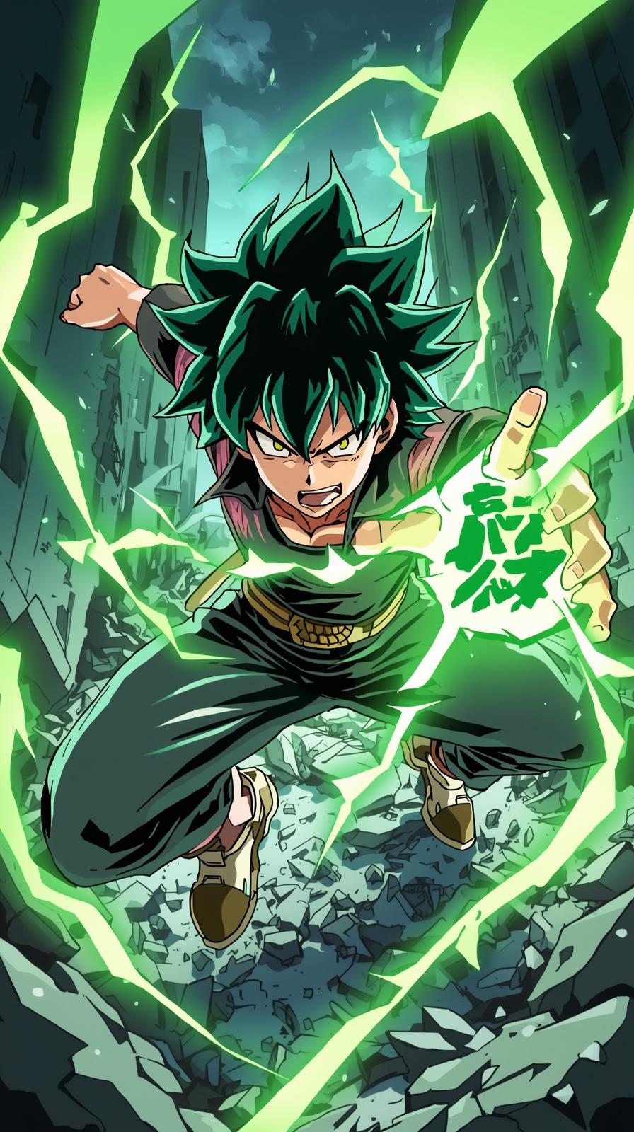iphone wallpaper 4k – High-action anime illustration of a hero with green hair unleashing electric lightning energy while descending into a crumbling urban city background.